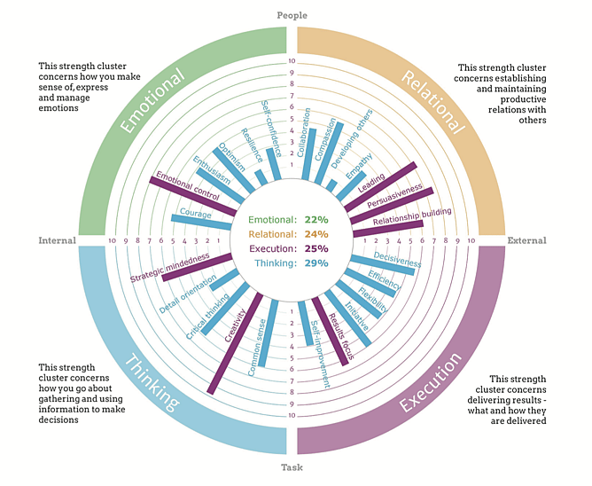 You complete an online questionnaire - it takes around twenty minutes - and what comes back is a picture of your strengths across 24 dimensions, grouped into four broad clusters: Emotional, Relational, Thinking, and Execution. You can see what that looks like in the wheel above - each bar representing one strength, its length showing how energising that strength is for that particular person.